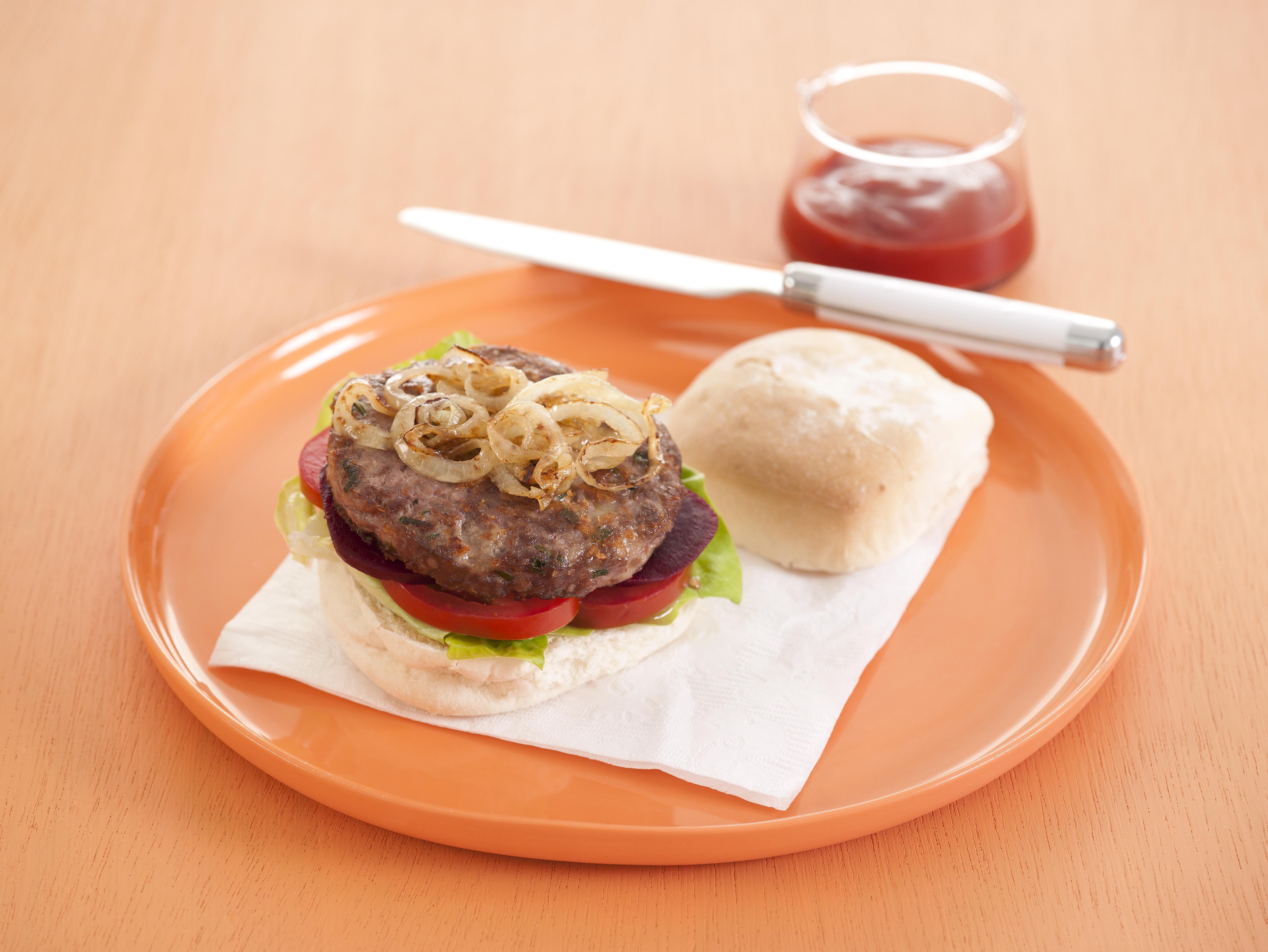 Serve in damper roll with shredded lettuce, sliced tomato, sliced beetroot, fried onion slices and tomato sauce.