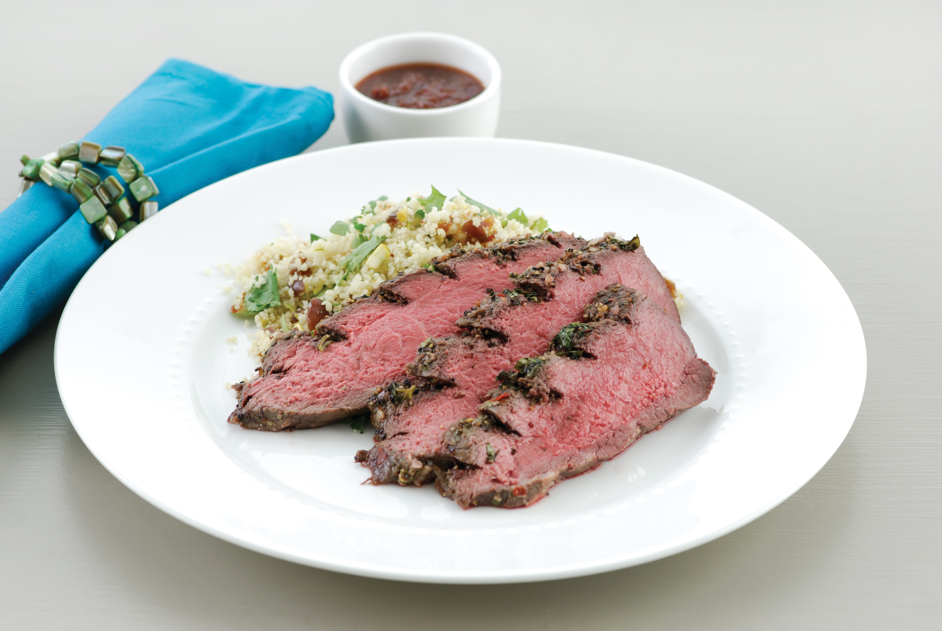 Carve into thick slices against the grain. Serve with cous cous salad.