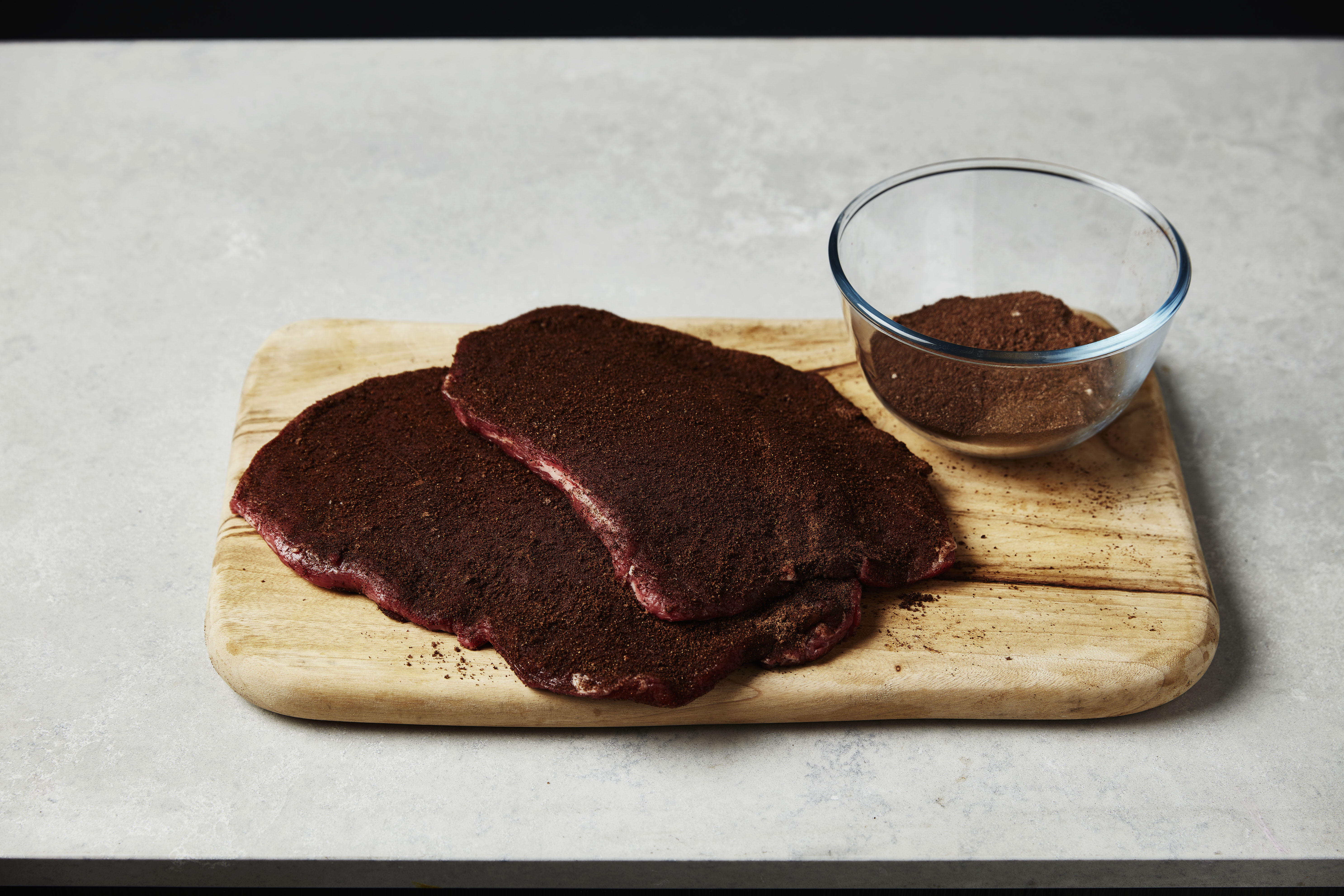 Sprinkle 1 - 2 teaspoons of the coffee rub on both sides of a ribeye steak. Rub the mixture in.