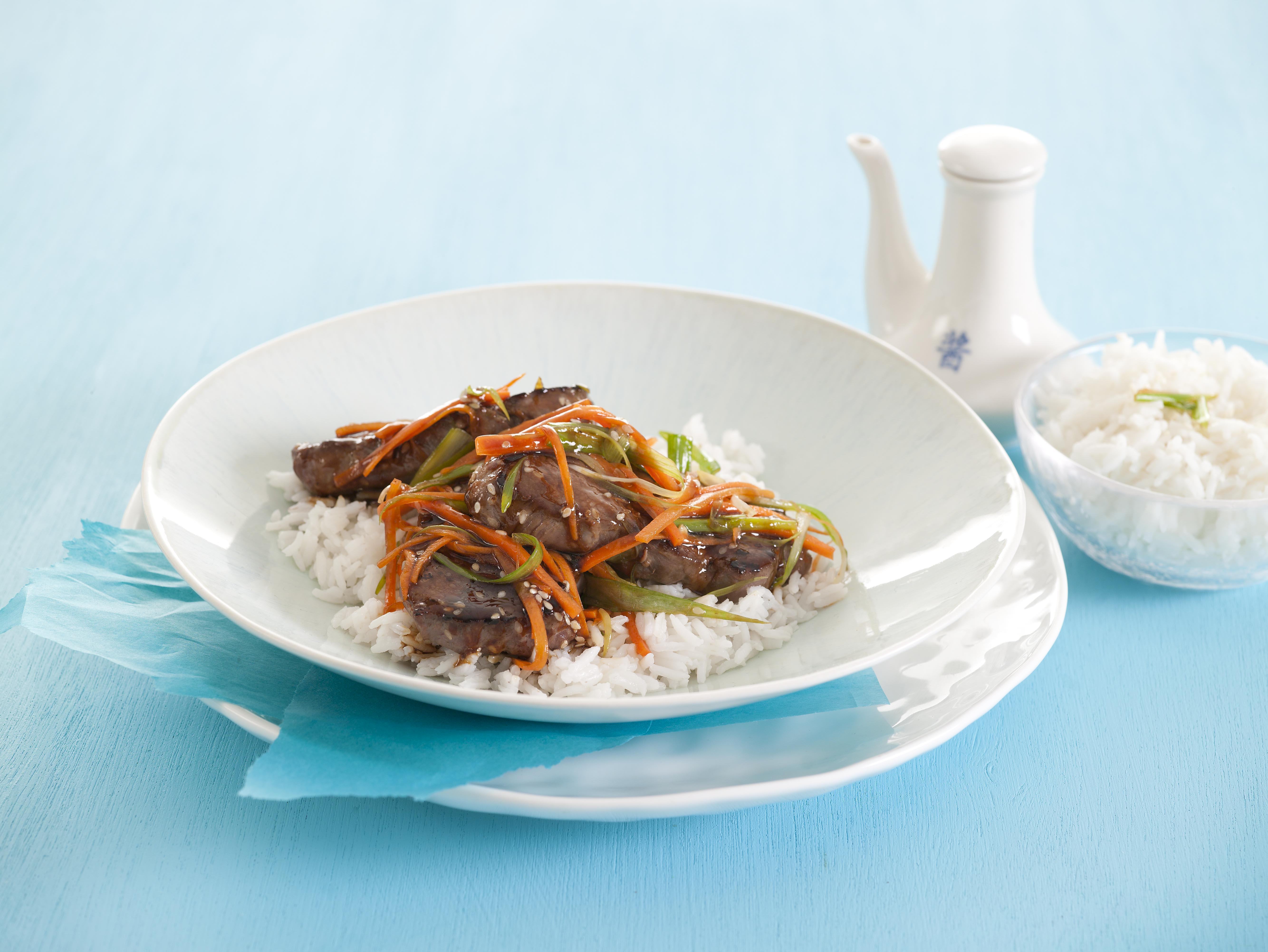 1. Heat flat BBQ plate or large heavy based frying pan over a high heat. Remove steaks from marinade and cook for 2 minutes on each side, or until browned.