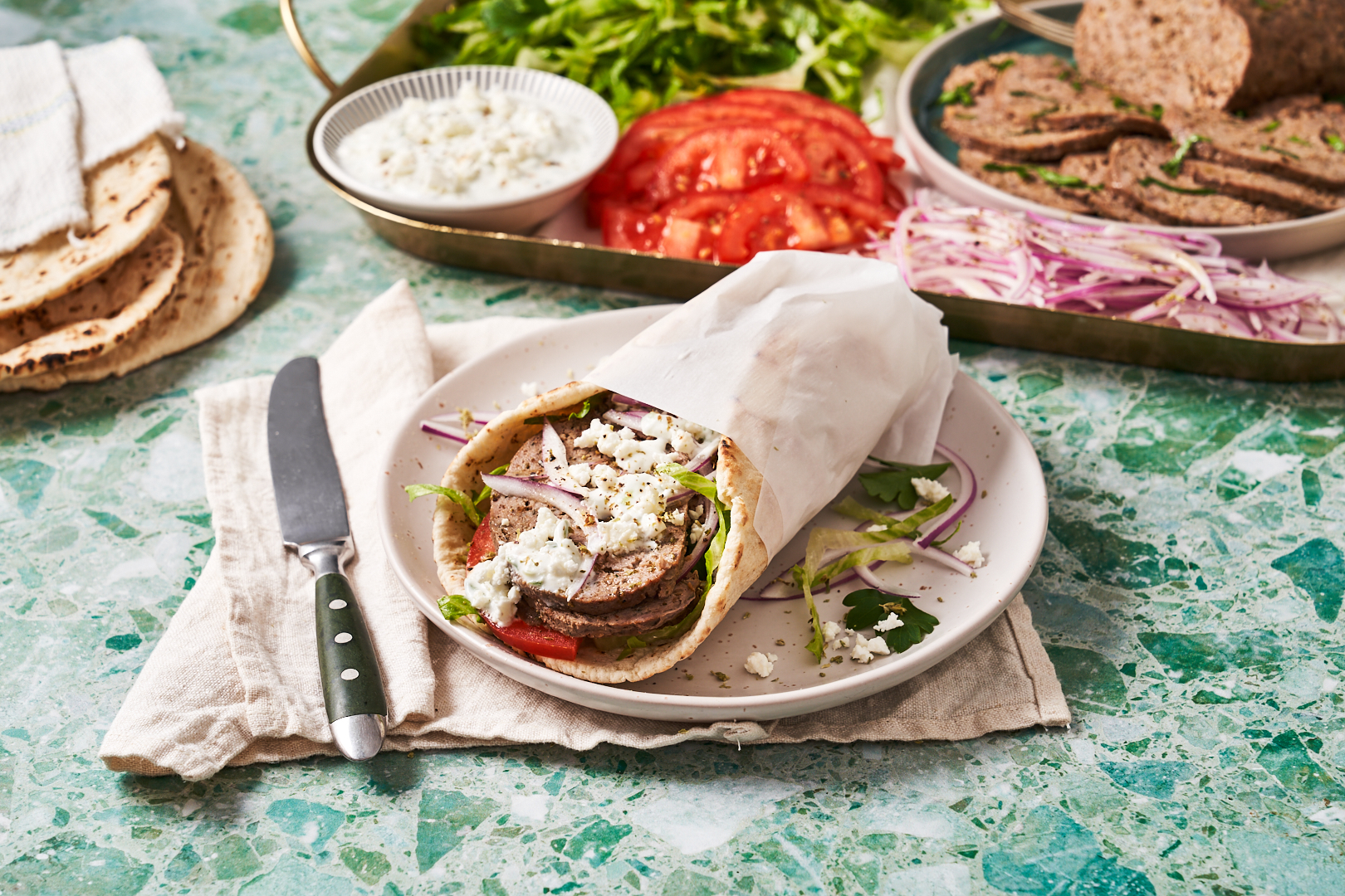 - Serve with pita bread, sliced lettuce, tomato and red onion, and Tzatziki Feta Sauce