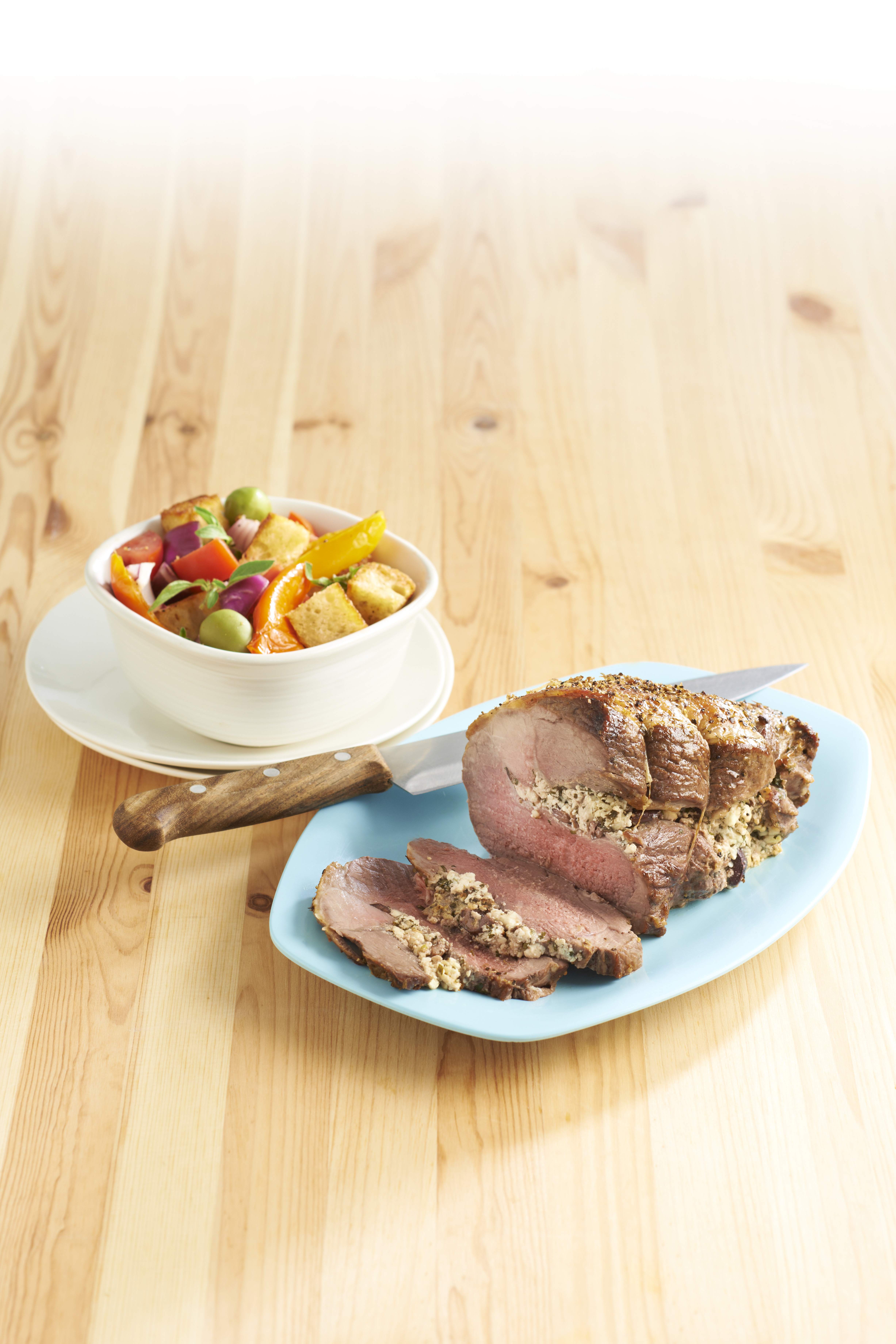 This lamb is full of surprises. Carve it to reveal the wonderful seasoning of olives and feta.
