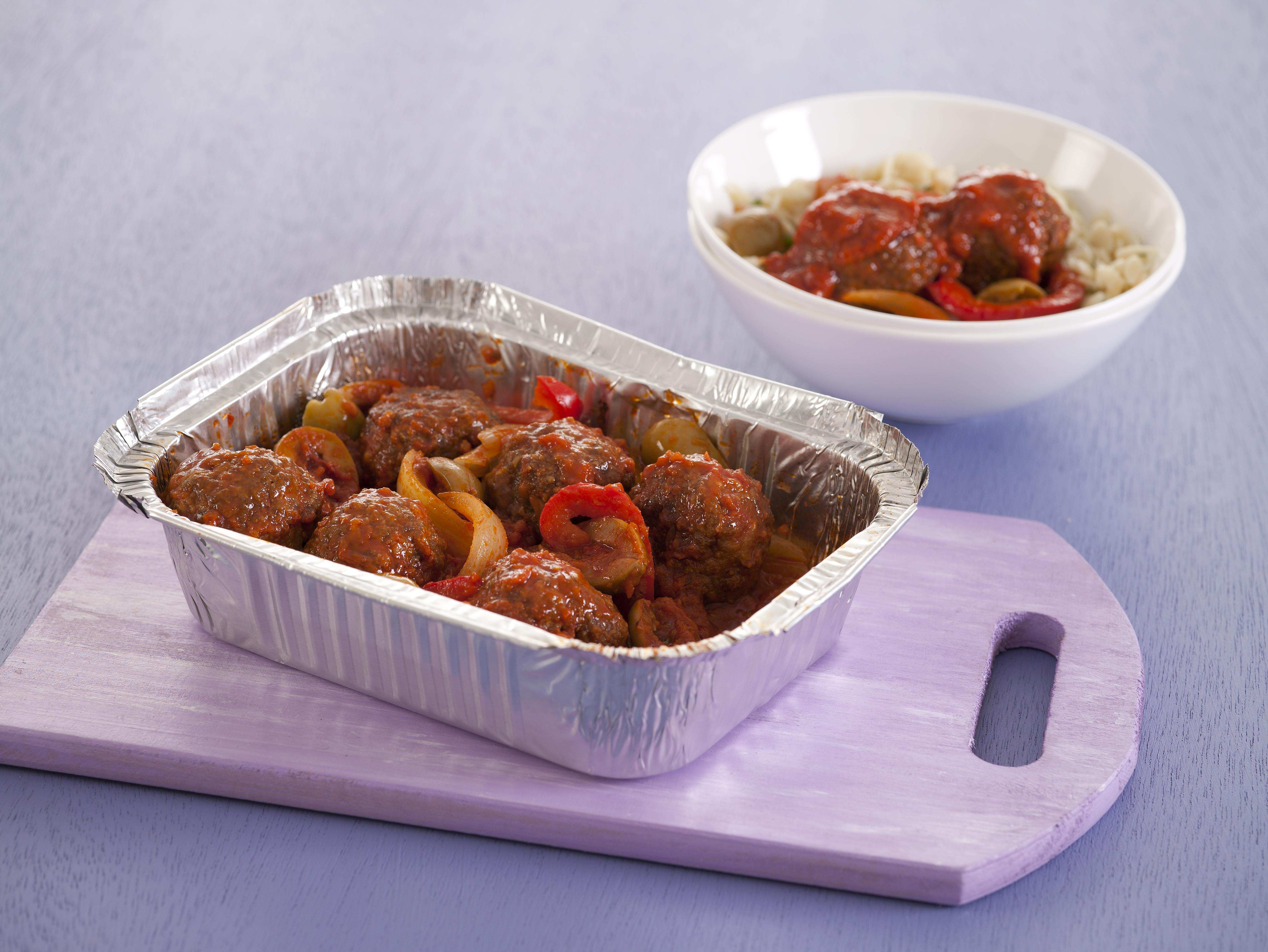 2. Place layer of onion and capsicum in base of each foil container. Top with 8 meatballs per container. Pour over pasta sauce (250ml container), and top with olives.