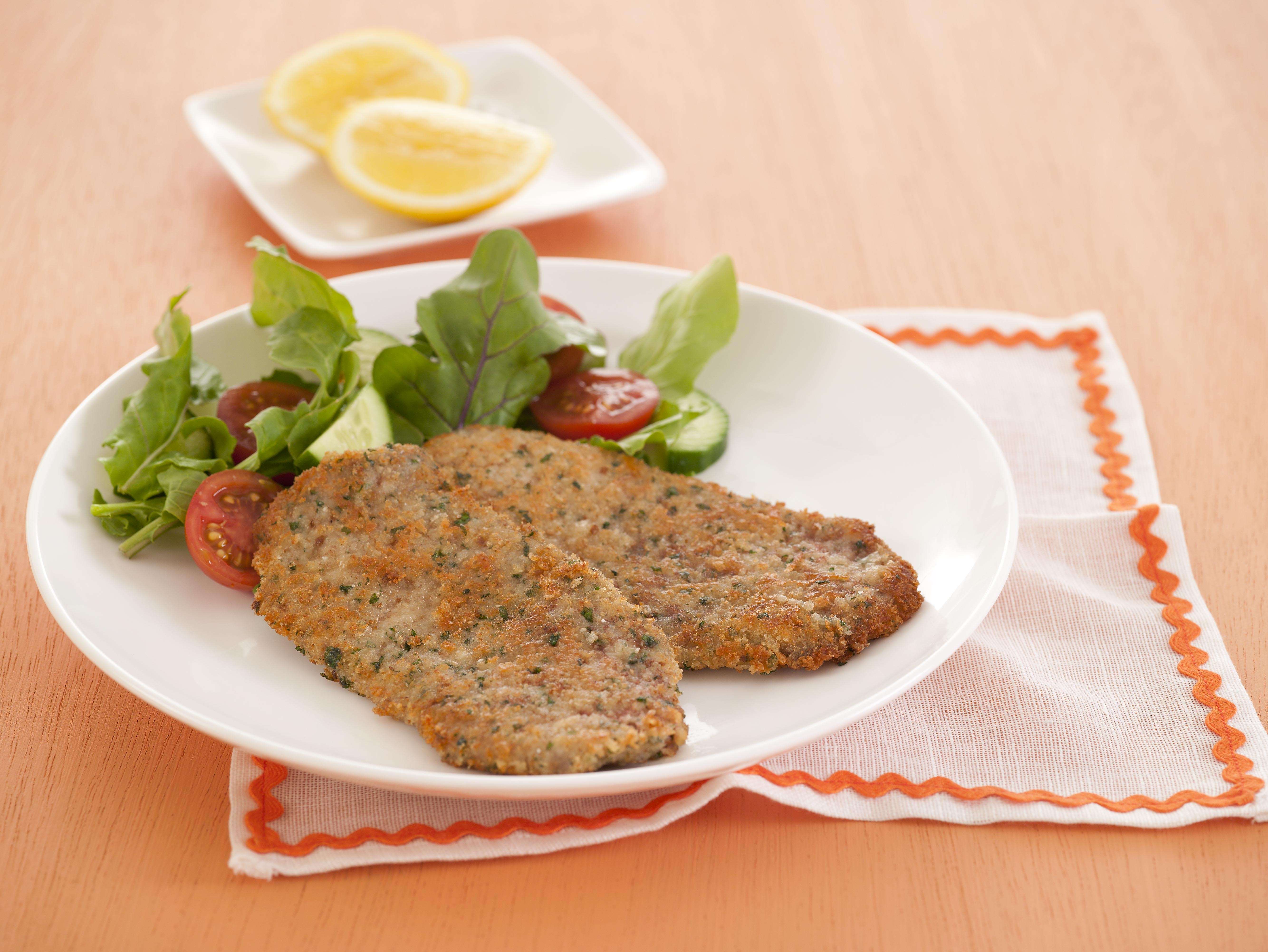 Serve two schnitzels per person with a salad and a wedge of fresh lemon.